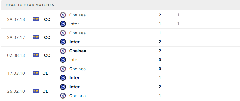 Thành tích đối đầu của Chelsea vs Inter