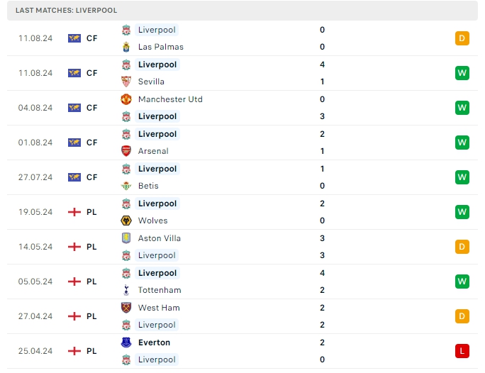 Trong khi đó với Liverpool ở mùa giải năm nay họ chào đón vị HLV mới, tuy vậy đội hình của The Kop vẫn không hề có nhiều xáo trộn chính điều này giúp Liverpool có được sự ổn định ở những trận đấu vừa qua, hàng công của Liverpool vẫn nắm giữ sức mạnh đáng sợ ở mùa giải vừa qua và ở 5 trận giao hữu vừa qua, hàng công mang về 10 bàn thắng, bên cạnh hàng thủ thi đấu chắc chắn khi chỉ nhận 2 bàn thua, khi thi đấu xa nhà ở 5 trận gần nhất Liverpool vẫn thi đấu ấn tượng ở hàng công với 11 bàn thắng và hàng thủ nhận 8 bàn thua.