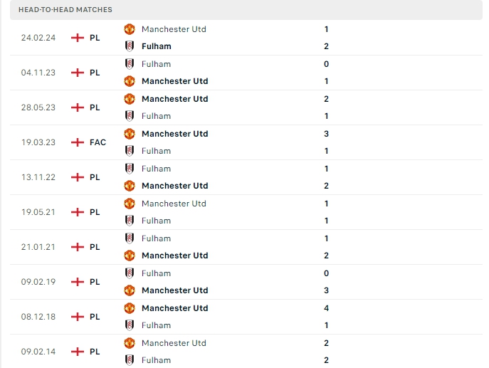 Lịch sử thi đấu của Manchester Utd vs Fulham