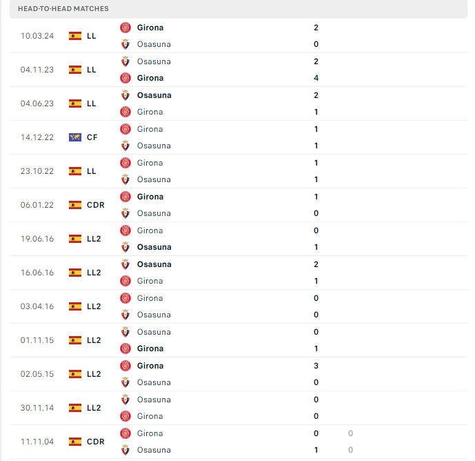 Lịch sử thi đấu của Girona vs Osasuna