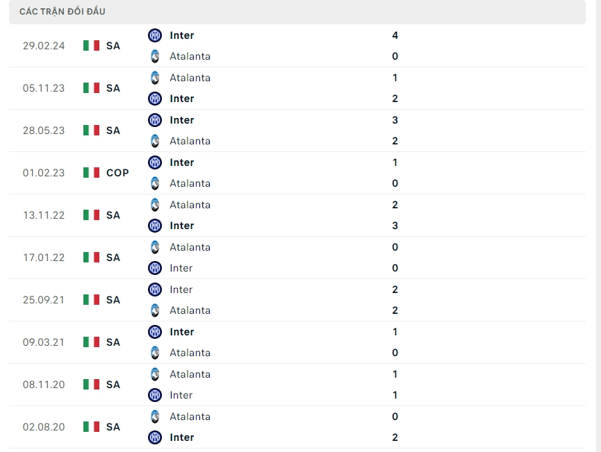 Ở lần gần nhất gặp nhau gần nhất là màn đụng độ mùa trước khi đó Inter Milan đánh bại Atalanta với tỷ số 4-0 ngay trên sân nhà , sẻ một lần nữa Inter Milan là những người kiểm soát thế trận và có được chiến thắng với tỷ số cách biệt trong trận đấu tới.