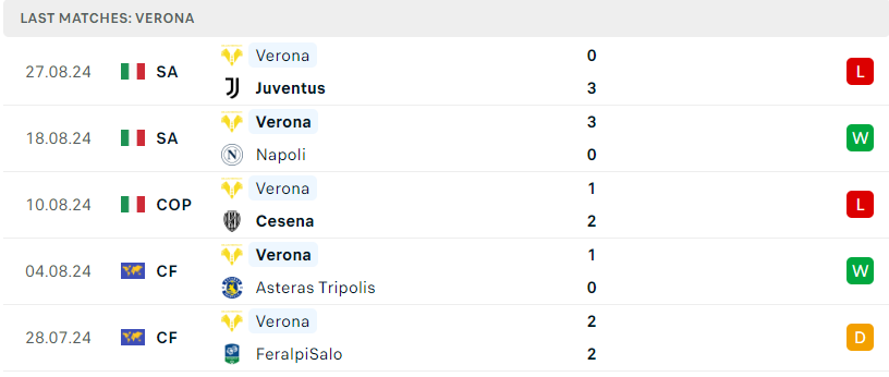Bên phía kia, dù Verona vừa để thua thê thảm 0-3 trước Juventus tại chính sân nhà, tuy nhiên những gì mà tập thể này đã thể hiện trước Napoli ở trận ra quân cũng là rất hứa hẹn. Dưới trướng Paolo Zanetti, Verona đã cải thiện đáng kể về mặt lối chơi, một lối đá không ngại va chạm và sẵn sàng đôi công với bất kỳ đối thủ nào đã giúp Verona đánh bại Napoli với tỉ số 3-0. Tuy vậy, nhưng mọi thứ cũng chỉ là mới bắt đầu và những thách thức vẫn còn rất nhiều phía trước.