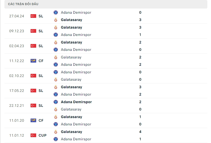 Lịch sử thi đấu của Adana Demirspor vs Galatasaray