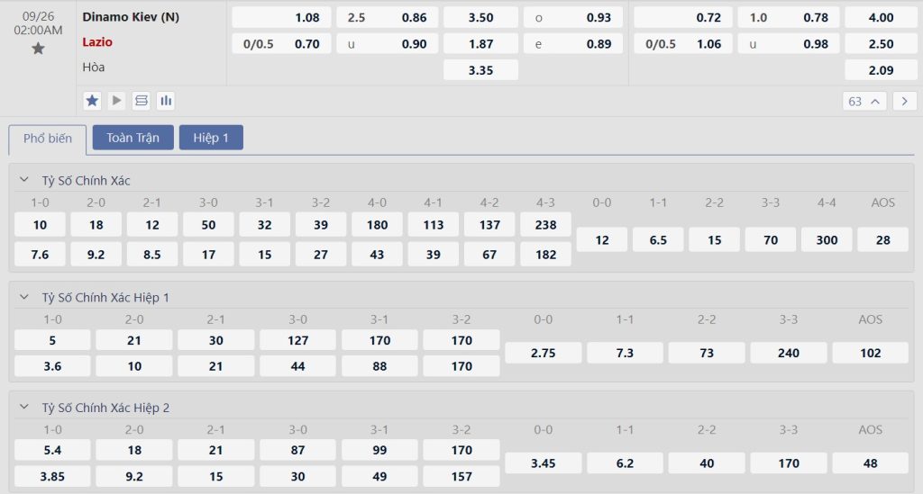 Kèo Châu Âu chứng kiến sự vượt trội của Lazio khi tỷ lệ cho chiến thắng của đội bóng Italia là 1.87 trong khi con số này bên phía Dinamo Kiev là 3.50. Tuy nhiên chênh lệch này là không đáng kể và hoàn toàn có cơ sở để tin vào khả năng giữ lại ít nhất 1 điểm của các học trò HLV Oleksandr Shovkovsky.