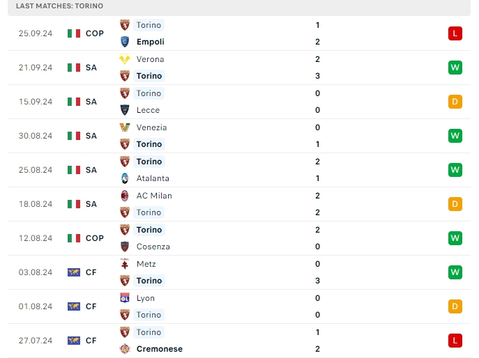 Torino vừa nhận thất bại trước Empoli ở vòng 1/16 Coppa Italia, còn ở sân chơi quốc nội chiến thắng gần nhất trước Verona là chiến thắng thứ 3 và cũng nối dài chuỗi bất bại lên con số 5 với 3 chiến thắng cùng 2 hòa, có được 11 điểm và đang dẫn đầu trên BXH sau 5 vòng đấu, hàng công của Torino mang về 8 bàn thắng, cùng hàng thủ nhận 5 bàn thua, 2/3 trận gần nhất của Torino khép lại không quá 2 bàn thắng, trên sân nhà của mình Torino 2 bàn thắng cùng 1 bàn thua phải nhận sau 2 lượt trận.
