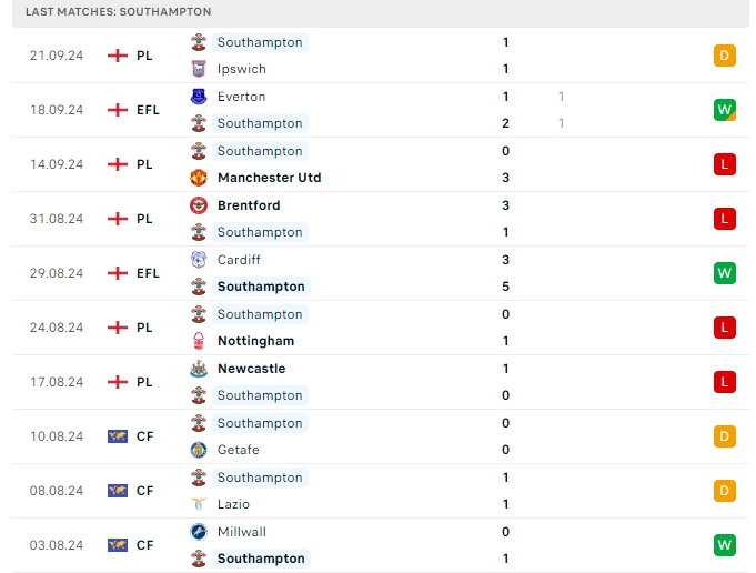 Trong khi đó với Southampton trận hòa trước Ipswich nối dài chuỗi phong độ kém cỏi của đội bóng này, sau 5 lượt trận với 4 thất bại và 1 hòa, có được 1 điểm và đang xếp vị trí thứ 18 trên BXH, hàng công của Southampton mang về chỉ 2 bàn thắng, cùng hàng thủ nhận 9 bàn thua, 3/5 trận đấu đó cũng khép lại 90 phút không quá 2 bàn, khi thi đấu xa nhà, hàng công của các vị khách có được 1 bàn thắng, cùng hàng thủ nhận 4 bàn thua.