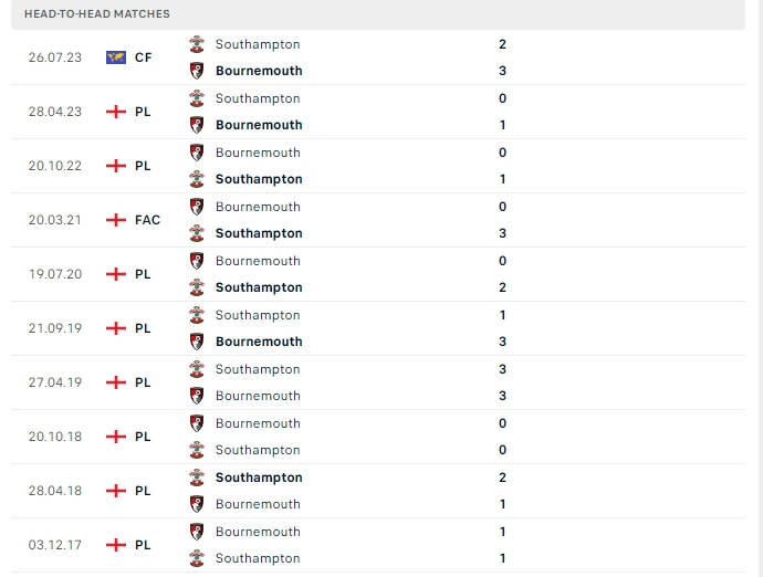 Lịch sử thi đấu của Bournemouth vs Southampton