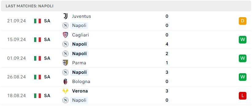 Ngoại trừ thất bại 0-3 đầy bạc nhược trước Verona ở trận ra quân, Napoli nhìn chung đang có màn trình diễn cực kỳ ấn tượng dưới thời tân HLV Antonio Conte. Thống kê cho thấy, sau 5 vòng đấu tại Serie A đội bóng này đã giành được 3 chiến thắng, 1 trận hòa và chỉ để thua 1 trận và Napoli hiện đang đứng thứ 2 trên BXH, chỉ kém Torino đúng 1 điểm.Dưới sự dẫn dắt của Conte, Napoli đang cho thấy sự tiến bộ rõ rệt và nếu cứ thi đấu với đà này, đội chủ sân Maradona sẽ sớm tìm lại hình ảnh quen thuộc.