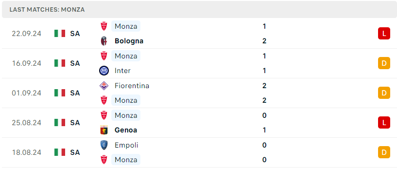 Bên phía kia, sự xáo trộn trên băng ghế chỉ đạo khiến Monza đang gặp vô vàn khó khăn ở mùa giải này. Sau 5 vòng đấu, đội bóng vẫn chưa giành được bất kỳ chiến thắng nào và hiện đang trôi nổi ở dưới đáy bảng xếp hạng. Lối chơi của Alessandro Nesta chưa cho thấy sự gắn kết và hiệu quả, khiến Monza liên tục mất điểm trước các đối thủ. Với tình hình hiện tại, Nesta và các học trò cần phải cải thiện rất nhiều nếu muốn tiếp tục mất điểm trong thời gian tới.