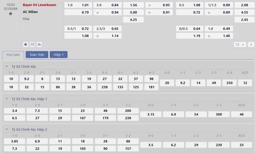 Bảng tỷ lệ kèo bóng đá trận đấu Bayer Leverkusen vs AC Milan