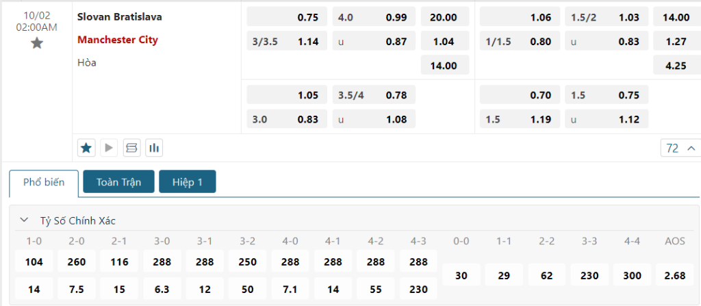 Bảng tỷ lệ kèo bóng đá trận đấu Slovan Bratislava vs Man City