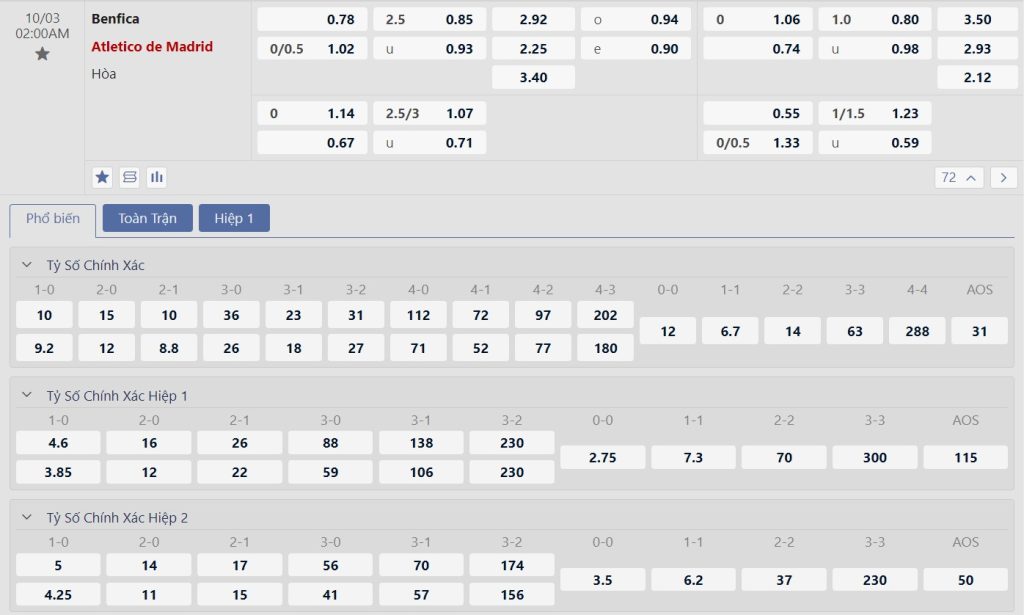 Kèo Châu Âu là sự nhỉnh hơn đôi chút của đội bóng Tây Ban Nha khi tỷ lệ cho chiến thắng của họ là 2.25 trong khi con số bên phía chủ nhà Benfica là 2.92. Thua thiệt không đáng kể, lại có điểm tựa da Luz, đoàn quân của HLV Bruno Lage đủ tự tin cũng như cơ sở để giữ lại ít nhất 1 điểm.