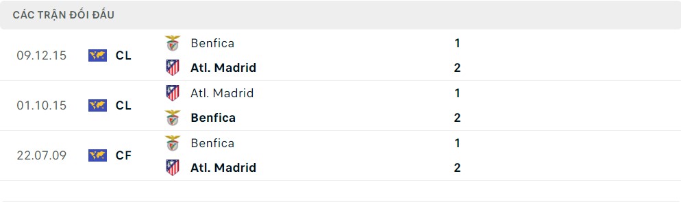 Lịch sử thi đấu của Benfica vs Atletico Madrid