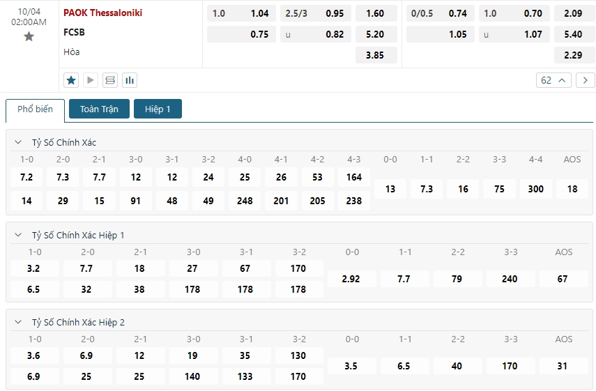 Kèo châu Âu vẫn đang là sự ưu thế lớn cho chủ nhà khi mức ăn của PAOK đang là 1.60 trong khi đó con số này của Steaua Bucuresti là 5.20, Dù có ưu thế sân nhà và được đánh giá cao hơn nhưng với phong độ không tốt cùng với đó là sự hưng phấn đến từ các vị khách sau màn trình diễn tốt thời gian qua thì PAOK hứa hẹn sẻ gặp không ít khó khăn và nhiều khả năng chỉ có 1 điểm ra về.