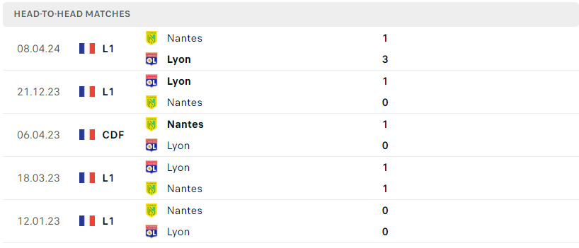 Trong cả 2 cuộc chạm trán mùa giải trước, Lyon đã toàn thắng trước Nantes, điều này cho thấy sự áp đảo của đội chủ nhà trong những lần đối đầu gần đây. Nếu tiếp tục duy trì được phong độ ổn định và tận dụng tốt những cơ hội, Lyon hoàn toàn có thể tiếp tục chuỗi thành tích ấn tượng trước Nantes trong trận đấu tới đây. Sự bản lĩnh, kinh nghiệm sẽ lên tiếng và giúp Lyon có được chiến thắng 2-0.