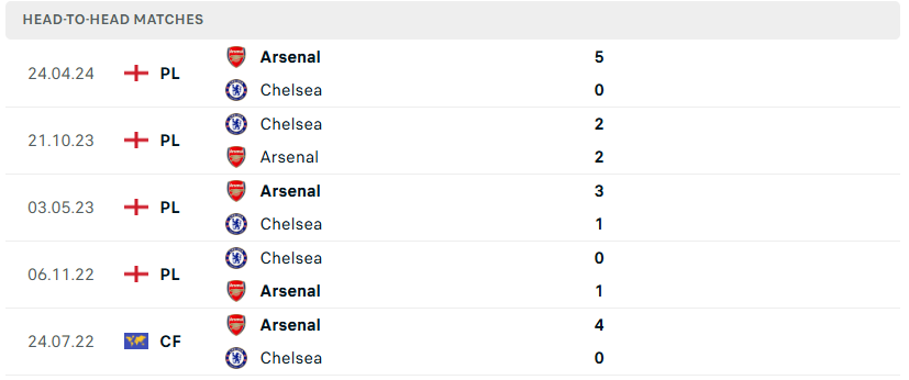 Thành tích đối đầu của Chelsea vs Arsenal