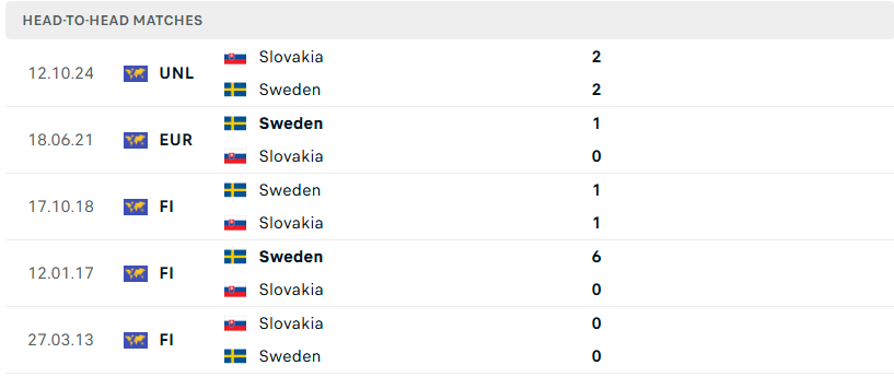 Thành tích đối đầu của Thụy Điển vs Slovakia