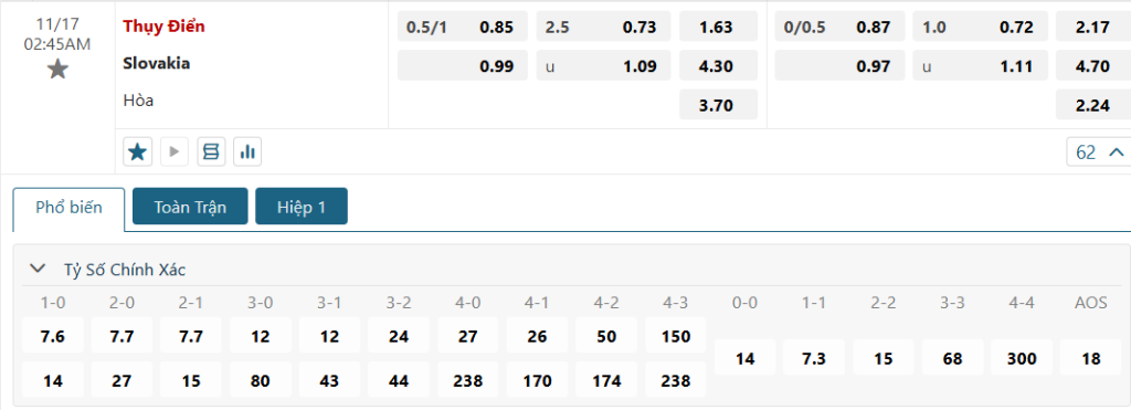 Kèo Châu Âu hiện vẫn nghiêng về đội chủ nhà khi mức ăn dành cho Thụy Điển là 1.63, trong khi của Slovakia là 4.30. Điều này cho thấy nhà cái đánh giá khá cao khả năng Thụy Điển sẽ giành trọn 3 điểm trên sân nhà. Với phong độ ổn định và lợi thế sân bãi, Thụy Điển hoàn toàn có thể tận dụng cơ hội này để vươn lên trong cuộc đua giành ngôi đầu bảng.