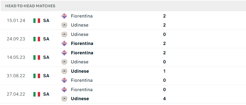 Thành tích đối đầu của Fiorentina vs Udinese