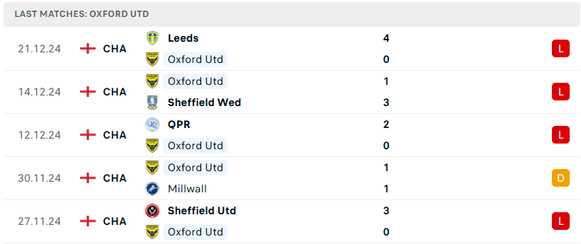 Trong quá khứ, đôi bên chỉ mới có 4 lần chạm trán, và tại đó Oxford Utd đều không thể đánh bại Cardiff. Tuy nhiên, đó đã là câu chuyện của 12 năm về trước. Hiện tại, với tình cảnh khốn khổ của cả hai, cơ hội trong trận đấu này sẽ được chia đều. Một Oxford Utd với lợi thế sân nhà cùng sự quyết tâm cao độ rất có thể sẽ tạo nên bất ngờ và nhận được phần thưởng xứng đáng trong ngày Boxing Day.