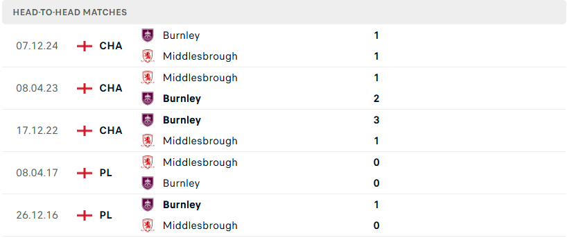 Thành tích đối đầu của Middlesbrough vs Burnley