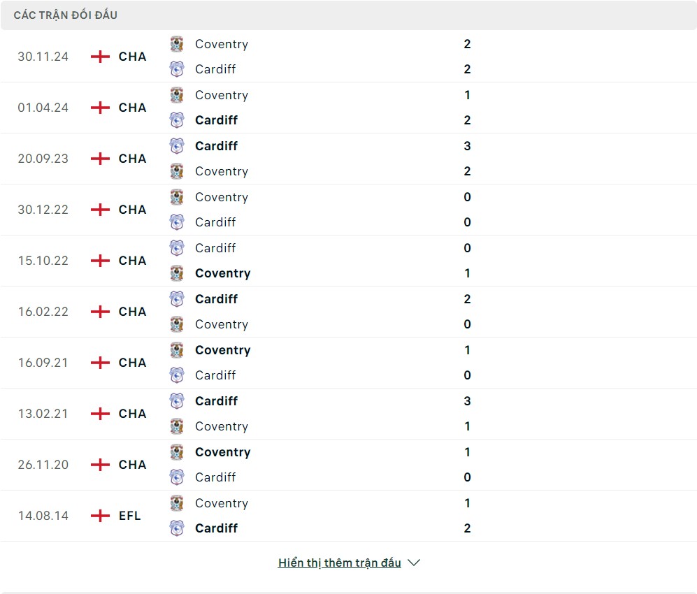 Lịch sử thi đấu của Cardiff City vs Coventry