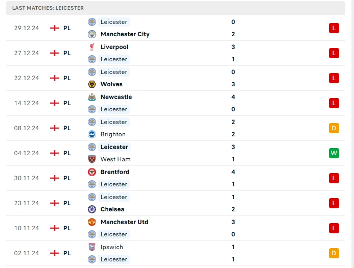Bên kia chiến tuyến , Leicester City ở vòng đấu gần nhất nhận thất bại 0-2 trước Manchester City, đây là thất bại thứ 4 liên tiếp và cũng là trận thua thứ 11 của họ sau 19 trận đấu, cùng với 3 chiến thắng và 5 hòa, có được 14 điểm và đang xếp vị trí thứ 19 trên BXH, vị trí trong nhóm cầm đèn đỏ, hàng công của Leicester City có cho mình 22 bàn thắng cùng hàng thủ nhận 42 bàn thua, 4/5 trận vừa qua của Leicester City khép lại 90 phút từ 3 bàn thắng trở lên, khi thi đấu xa nhà Leicester City có được 11 bàn thắng cùng hàng thủ nhận 25 bàn thua, 4/5 trận xa nhà vừa qua cũng vượt mốc 3 bàn.