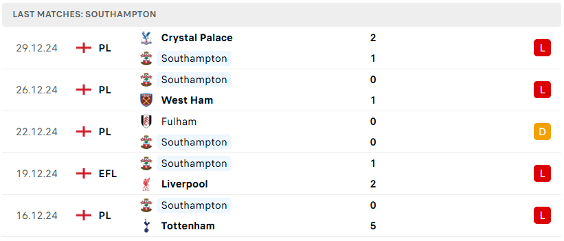 Chuỗi thành tích kém cỏi kể từ khi thăng hạng đã buộc Southampton phải sa thải Russell Martin trước dịp lễ Giáng Sinh. Tuy nhiên, việc bổ nhiệm Rubén Sellés vẫn chưa mang lại hiệu quả khi đội chủ sân St. Mary’s tiếp tục thi đấu bết bát với 3 trận thua và 1 trận hòa sau đó. Hiện tại, The Saints vẫn đang đứng cuối BXH với vỏn vẹn 6 điểm sau giai đoạn lượt đi. Nếu không nhanh chóng cải thiện, viễn cảnh xuống hạng sẽ ngày càng trở nên rõ ràng hơn đối với đội bóng này.