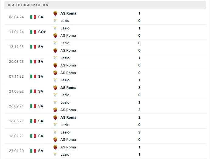 Những màn đụng độ giữa Roma và Lazio thường diễn ra chặt chẻ với ít bàn thắng được tạo ra, cụ thể 7/10 trận gần nhất hai đội gặp mặt nhau và 4/5 trận đón tiếp Lazio trên sân Stadio Olimpico, khép lại không quá 2 bàn, trận đấu được đánh giá cân bằng và không có quá nhiều bàn thắng.