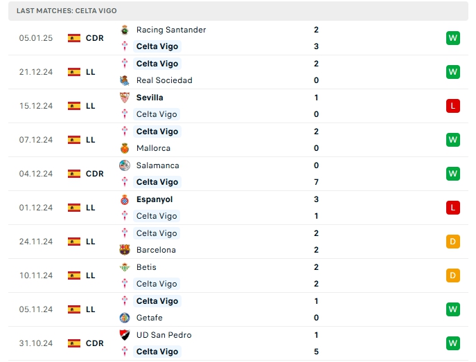 Lịch sử thi đấu của Rayo Vallecano vs Celta Vigo